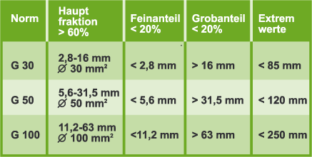 In der Praxis ist auch in Deutschland die Klassifizierung nach der älteren österreichischen Norm ÖNORM M 7133 verbreitet. Hier sind Angaben zur Körnung und zum Wassergehalt gegeben.